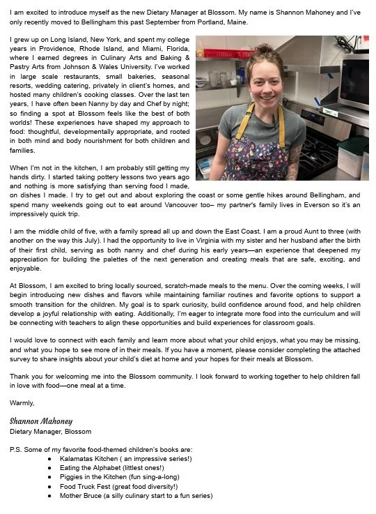 Much like gardening, baking and cooking activities are incorporated into curriculum! Not only do the children learn about the process of watching food evolve from seed to table; they take pride in their creations — enhancing their creativity and self-esteem. After many requests from Families, Blossom created a cookbook which includes tried and true children’s favorites!