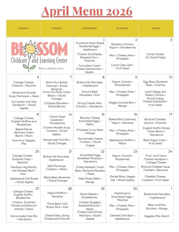 We include organic whole wheat flours, non-hydrogenated ingredients and limit sugars by sweetening with honey or other alternatives. We strive to use organic produce when possible, including items from our gardens when available. Our goal as a Center is to avoid pre-made foods by using whole grains and beans in hearty casseroles, soups and breads. During meals and snacks children are encouraged to eat healthy portions. Our Dietary Manager will address special needs.